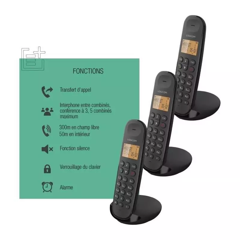 Le Téléphone fixe sans fil LOGICOM DECT ILOA 350 TRIO est l'outil idéal pour rester connecté avec vos proches en toute simplicité. Ce pack de trois téléphones sans fil au design élégant et moderne en coloris noir s'intègre parfaitement dans n'importe quel intérieur.