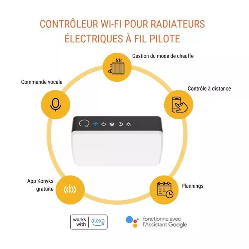 L'une des spécificités du Konyks eCosy + Termo est sa compatibilité avec les assistants vocaux tels qu'Amazon Alexa et Google Assistant. Vous pouvez donc contrôler la température de votre maison simplement en utilisant votre voix.