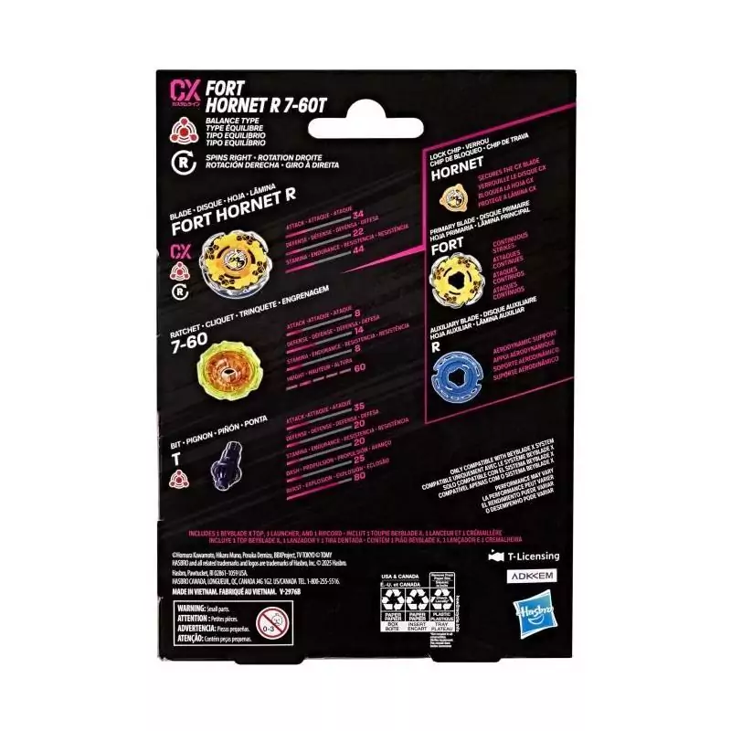 Le Beyblade X Starter Pack Fort Hornet R 7-60T CX est une toupie de compétition de type équilibre, fabriquée par Takara Tomy, spécialement conçue pour les enfants à partir de 8 ans.