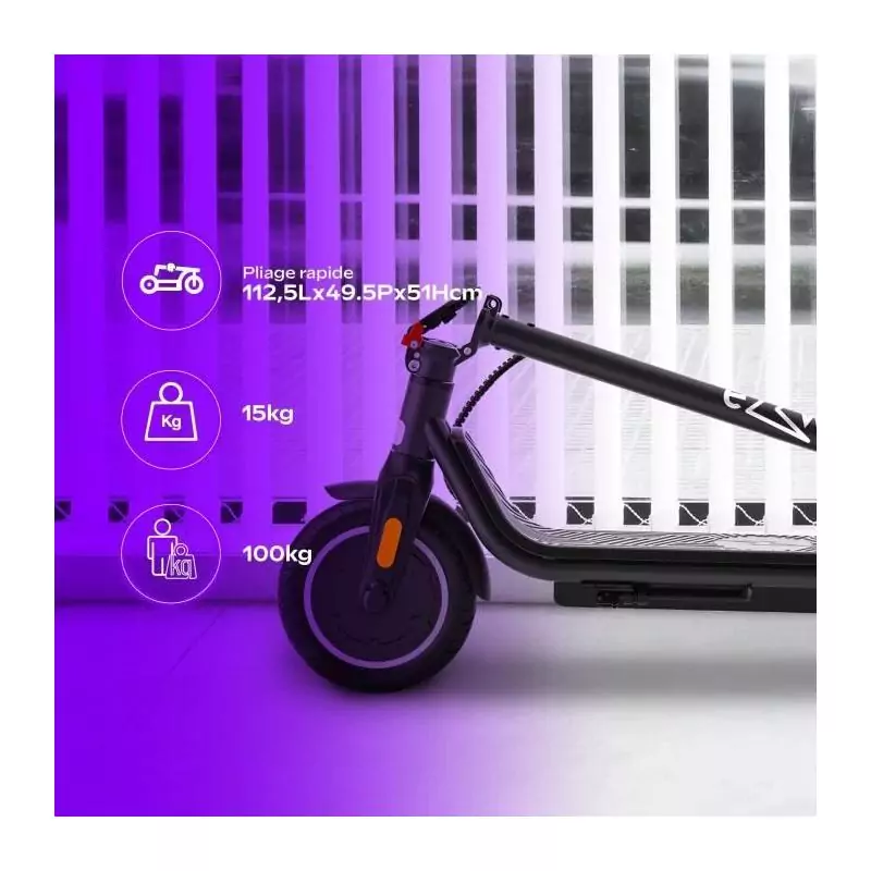 Compacte et légère, la Trottinette électrique EX85 est facilement transportable, que ce soit dans les transports en commun ou dans le coffre d'une voiture. Son design élégant et moderne saura vous séduire, tout en vous offrant un moyen de déplacement pratique au quotidien.