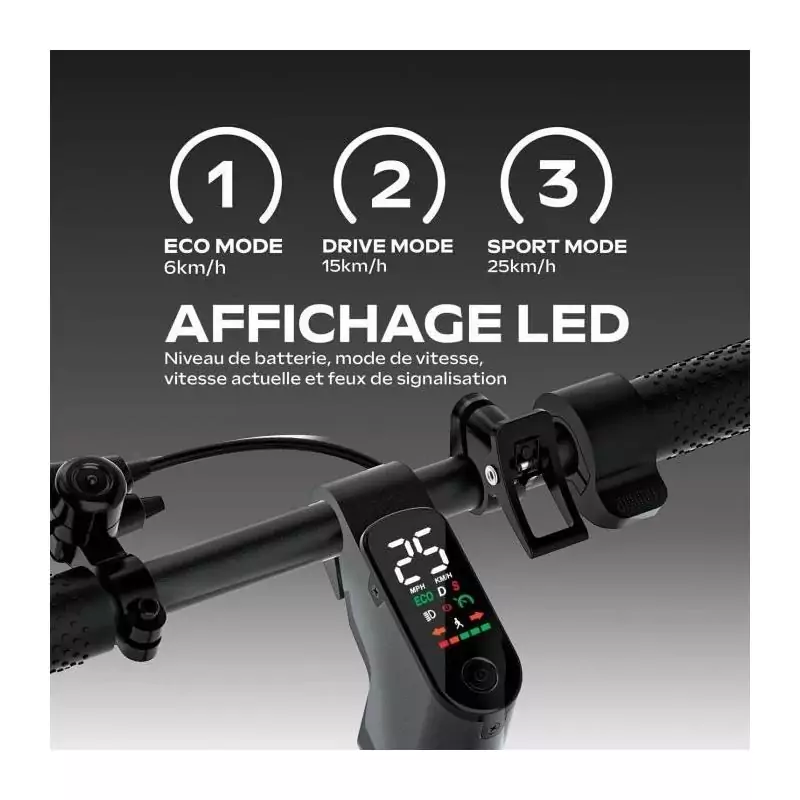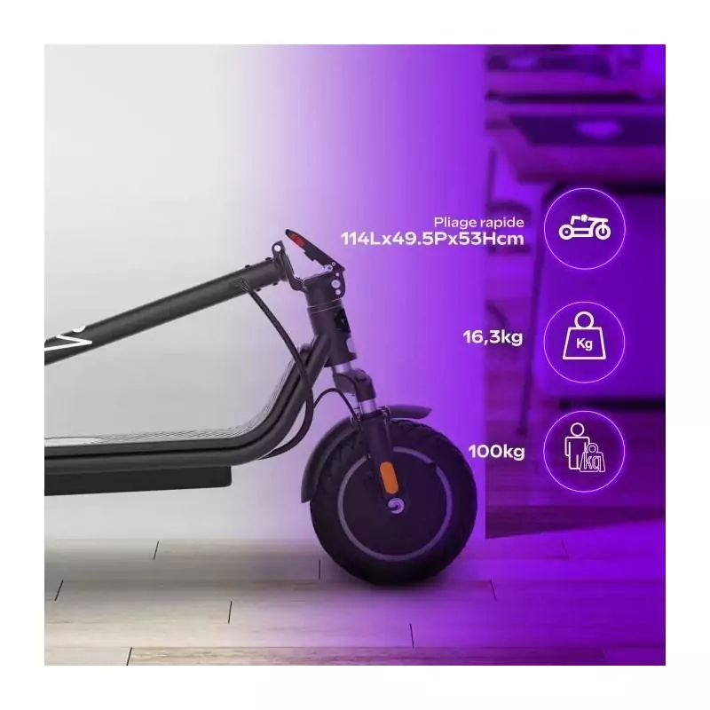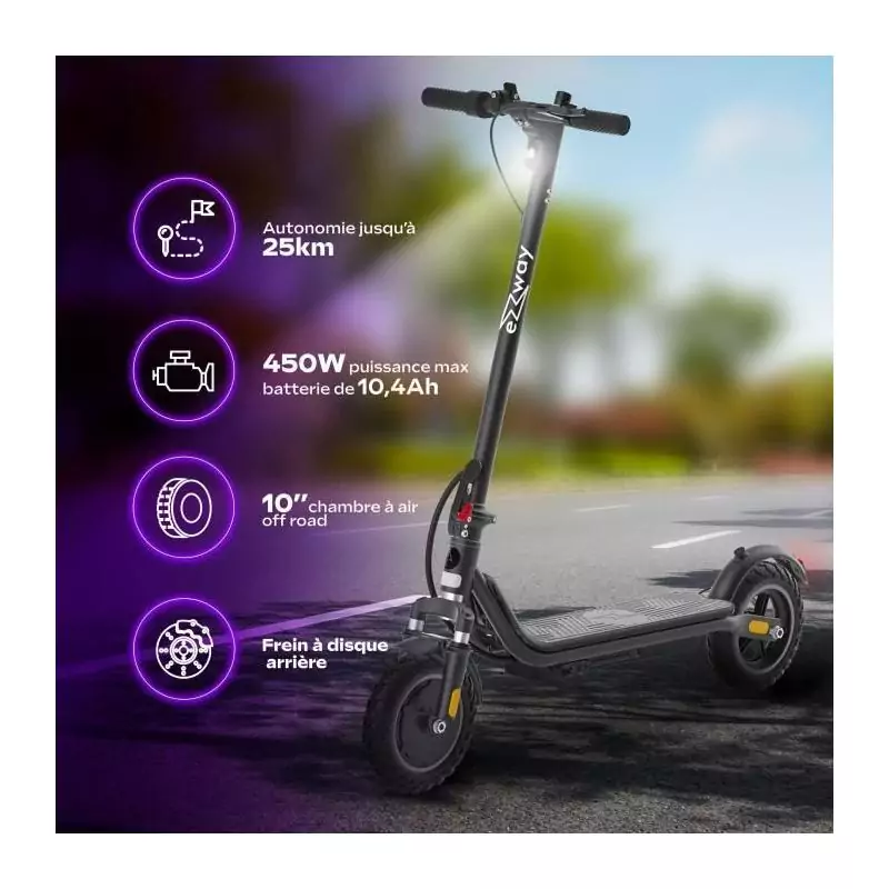 Les roues de 10 pouces de la trottinette électrique EX100 vous garantissent une bonne adhérence sur tous types de surfaces, assurant ainsi votre sécurité lors de vos déplacements. De plus, sa batterie longue durée vous offre une autonomie de 25 km, ce qui vous permet de parcourir de longues distances sans avoir à vous soucier de recharger la batterie en permanence.