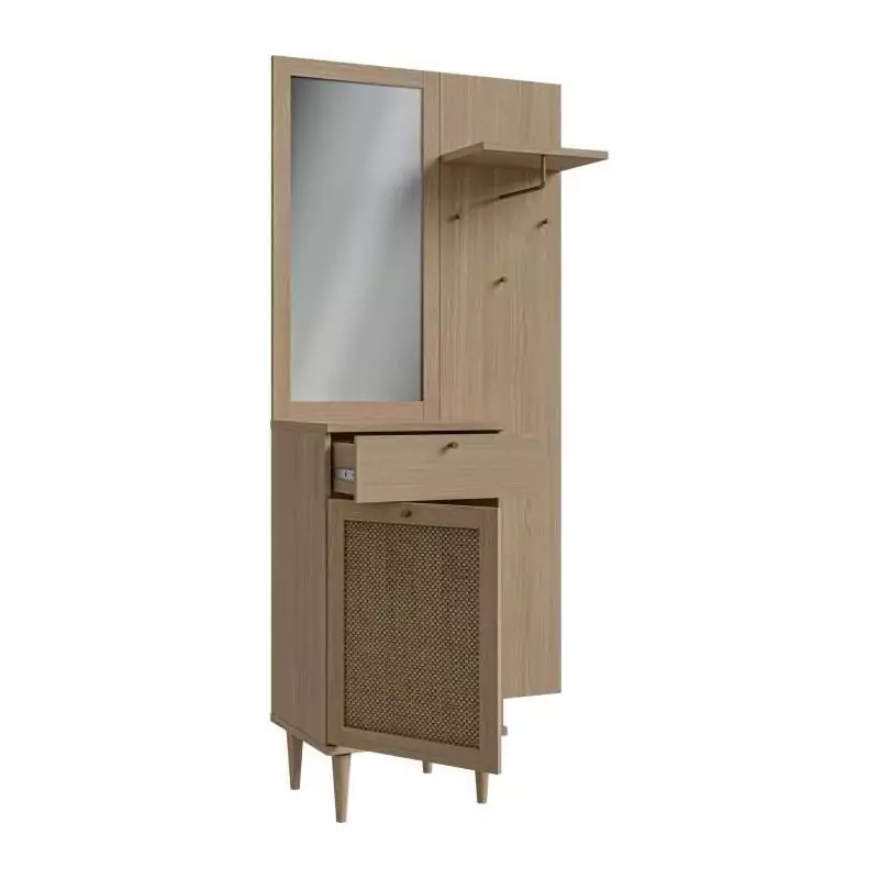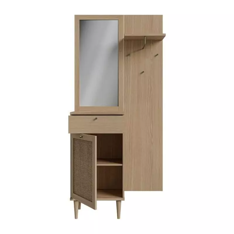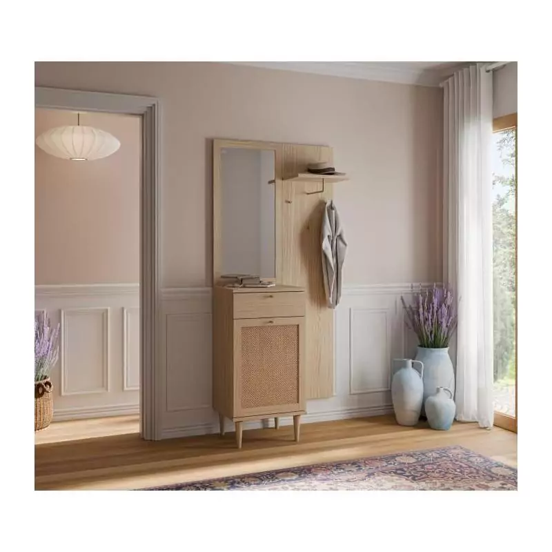 Ce meuble d'entrée se compose d'une porte et d'un tiroir, vous permettant de ranger vos manteaux, chaussures, écharpes et autres accessoires facilement accessibles. Le design en chêne apporte une touche naturelle et chaleureuse à votre intérieur, s'intégrant parfaitement à différents styles de décoration.