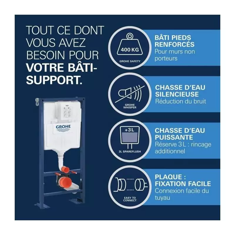 Ne cherchez plus, le Pack Bâti support 5 en 1 de GROHE est la solution tout-en-un pour des toilettes fonctionnelles et esthétiques. Offrez-vous le meilleur de la technologie et du design avec ce pack complet et performant.